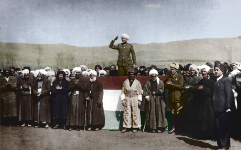 Qazi Mohammed stands above the Republic of Mahabad newly formed government in 1946. (Source: The Kurdish Center for Studies)